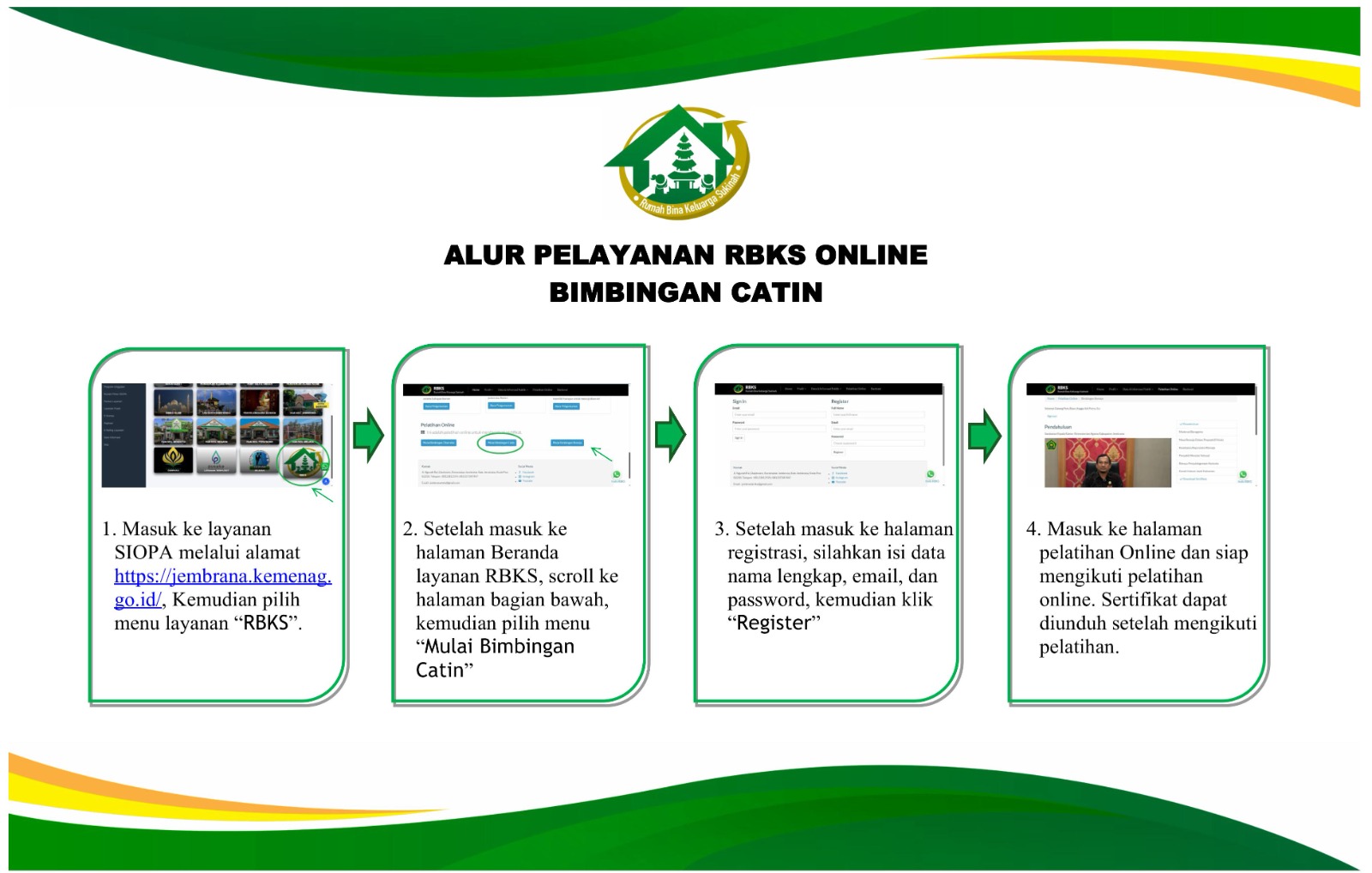 Bagi calon pengantin yang berada di negara lain dan memiliki perbedaan waktu yang sangat jauh dengan Indonesia dapat memilih layanan Bimbingan Perkawinan melalui pembelajaran elektronik (E-LEARNING) dalam website ini, Sertifikat Bimbingan Perkawinan melalui layanan e-learning dapat dibawa bersamaan dengan Surat Keterangan Pemeriksaan Kesehatan Catin (Calon Pengantin) paling lambat pada saat prosesi perkawinan (memadik/mereraosan).